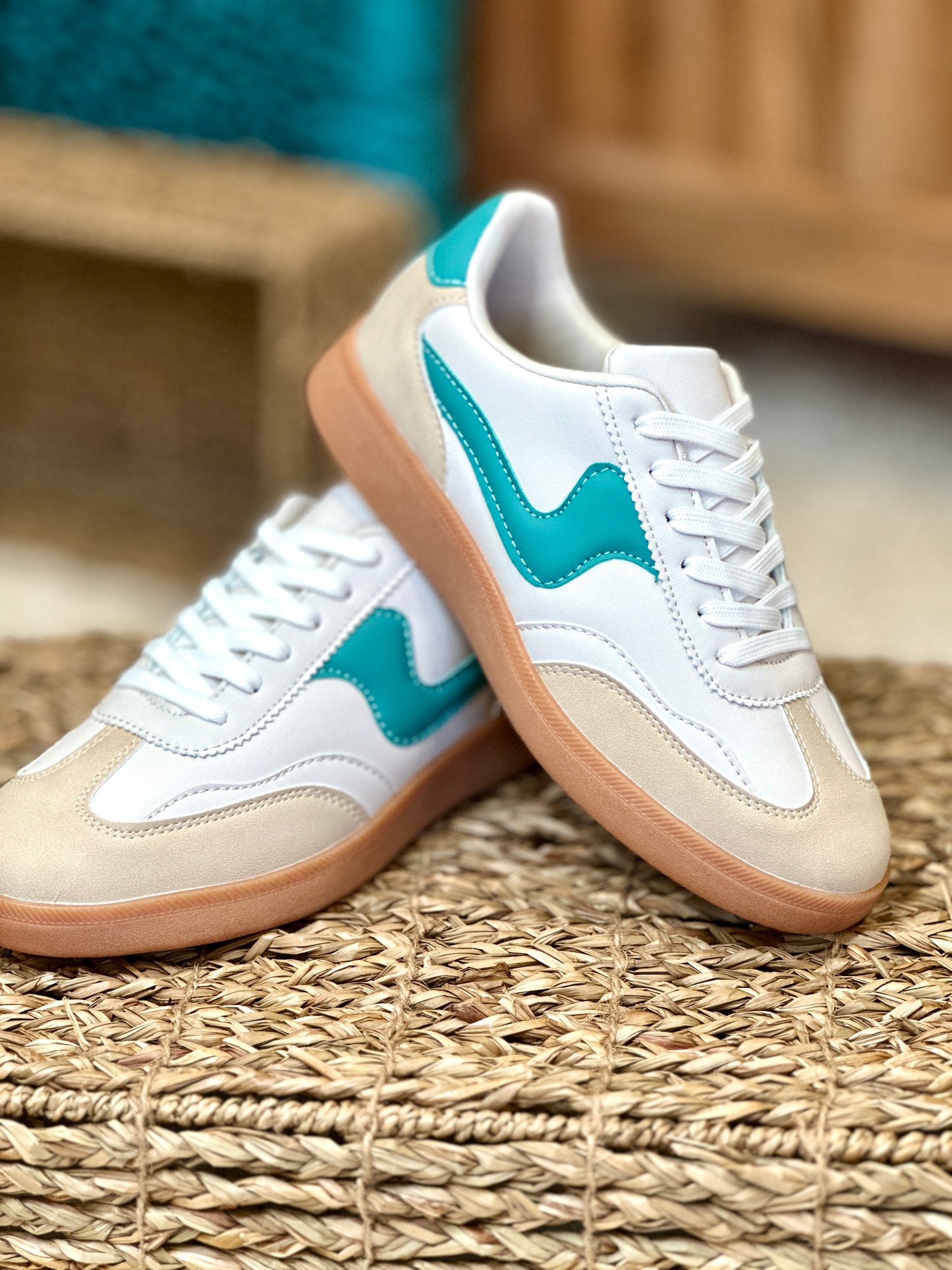 Step into style and comfort with these super comfy white sneakers, featuring chic teal accents for a fresh pop of color. Designed with a trendy gum sole, these sneakers offer both durability and a stylish edge. Perfect for everyday wear, they pair effortlessly with any outfit, from casual jeans to sporty athleisure looks. Whether you're on the go or kicking back, these sneakers are a must-have for effortless style and all-day comfort!